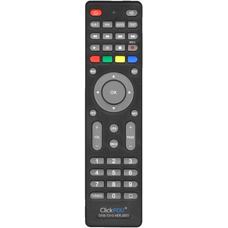 Универсальный пульт ClickPdu DVB-T2+3 ver.2021 – это универсальный пульт, который заменяет множество пультов определенного бренда. В основном эти пульты не требуют настройки, просто вставили батарейки и пользуетесь, но иногда, когда настройка все-таки необходима, она сводится к нажатию всего двух клавиш. Из чего можно сделать вывод, что им могут пользоваться даже люди далекие от электроники. Его корпус очень часто совпадает с корпусом вашего родного пульта, поэтому у вас не будет привыкания к расположению на нем кнопок. Все они находятся на привычных местах.